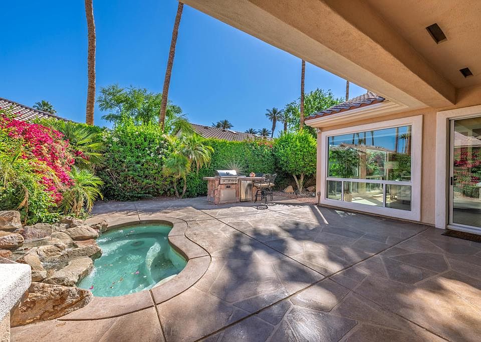 Sun City Palm Desert - San Remo. Built in 2004, this sought-after estate series San Remo model is ideally located near the Mountain View Clubhouse with its fitness center, indoor pool, driving range, tennis and pickleball courts, and hobby studios. The home sits on a spacious north-facing lot featuring an in-ground spa, built-in BBQ island with bar seating, and an expansive decorative concrete patio--perfect for entertaining or relaxing outdoors. Impressive curb appeal begins with a towering foyer, leaded glass double doors, gated courtyard, and decorative concrete hardscape. Inside, tile flooring runs throughout all but the bedrooms, and the great room showcases a dramatic 14-foot vaulted ceiling. Elsewhere, 10-foot ceilings create a light, open feel. The family room offers a gas fireplace with tile surround and a custom media center. The chef's kitchen boasts stainless steel appliances, including a Wolf cooktop, granite counters and backsplash, pendant and under-cabinet lighting, pantry, and 36-inch cabinetry. The primary suite includes a bay window, large walk-in closet with mirrored doors, and a bathroom with dual sinks, glass-enclosed shower, and oversized soaking tub. The guest wing, located on the opposite side of the home, offers two bedrooms and a full bath for added privacy. Additional features include a utility room off the garage, and a garage with epoxy floor, utility sink, overhead storage rack, and its own A/C unit.