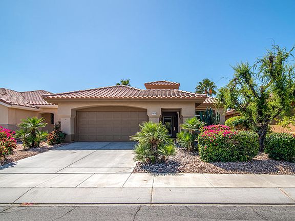 Located in the Sun City Palm Desert community of Palm Desert, California, Beautiful freshly painted featuring the Tiffany floorplan. Built in 1993, the home offers 2 bedrooms and 2 bathrooms within a 1,464 sq ft living space on a 4,792 sq ft lot. Notable interior features include 18-inch porcelain tiles throughout most of the home, with carpeting in the bedrooms, as well as crown moldings, high ceilings, recessed lighting, and storage space. The kitchen is equipped with Corian countertops, and center island. Additional amenities encompass ceiling fans, a garage with storage cabinets, and vertical blinds on all windows. The property is situated between two clubhouses, offering a private rear yard with ample foliage. The community provides various amenities, such as golf course, fitness centers, and multiple recreational facilities.