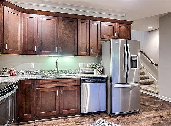 Beautiful Townhouse in Rockwood Commons, right across emerging Blue hawk shopping Plaza with easy access to Highway 69! Come checkout this gorgeous home with granite countertops in kitchen, dark oak cabinets and sparkling stainless steel appliances. Main level offers awesome wood floors w/ Living room, Dining room and Kitchen all in one spacious open floor plan! Half bathroom located on the main floor for convenience. Upstairs you'll find spacious 2 bedrooms, each with its own bathroom. Master bedroom has beautiful granite countertop, double vanity and walk in closet. Convenient laundry on bedroom level. Finished basement w/egress window and full bath could be enjoyed as 2nd living space or convert to 3rd bedroom. Right in the heart of Overland Park and within the coveted Blue Valley School District