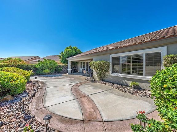 Sun City Palm Desert - St. Croix. This sought-after floorplan features 2 bedrooms, 2 bathrooms, a den, hobby/bonus room, and a 2-car plus golf cart garage. The north-facing rear yard offers privacy with no homes flush behind, lush desert landscaping including citrus, peekaboo mountain views, and an expanded patio for outdoor living. Curb appeal is enhanced by an updated paint scheme and leaded-glass entry door. Inside, 19-inch tile flooring runs throughout the main living areas, while the bedrooms feature vinyl plank. Upgraded baseboards and extensive crown molding add a refined touch. The greatroom boasts an upgraded slider and windows framing the rear yard. Double doors lead to a den with custom built-ins, while a pocket door opens to the hobby/bonus room, also equipped with built-in desk and shelving. The kitchen showcases abundant cabinetry with pullout shelves, a chef's island, breakfast bar, stainless appliances including double wall ovens, slab granite counters, tile backsplash, and upgraded fixtures. The primary suite offers a spacious retreat with custom built-in cabinetry, media center, shutters and a walk-in closet with built-in storage. Its spa-like bath includes a floating vanity with granite counter, upgraded dual sinks, lighting, and a custom tile shower with rimless glass enclosure. The guest bath is equally upgraded with a floating granite vanity, modern fixtures, and a tub/shower with glass enclosure. The laundry room provides ample cabinetry, granite counters, and a utility sink. Completing the home is a 2+ car garage with golf cart space and abundant storage.