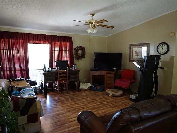 This property has a double wide mobile home.The Palm Harbor is a 28x70 with 3 bedrooms and 2 baths (occupied property). Has a nice covered porch, storage building, small shop with an overhead door, 2 car carport, RV parking. This mobile home sits on 6.5 acres MOL.