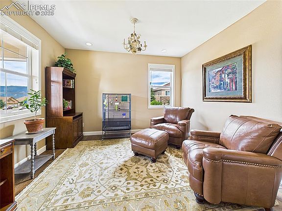 Immaculately maintained and thoughtfully upgraded, this stunning residence on a spacious corner lot offers timeless style, comfort, and panoramic views of Pikes Peak. From the welcoming front porch to the meticulous xeriscape landscaping, pride of ownership is evident throughout.    Step inside to discover a bright and private flex space off the foyer and a stylish powder room with designer touches. The heart of the home is an open-concept living space featuring a gourmet kitchen with abundant cabinetry, a large quartz island, gas cooktop, and stainless-steel hood—perfect for entertaining. A sunlit dining area surrounded by windows flows seamlessly into the spacious living room with a warm fireplace and rustic wood accent wall.    Upstairs, enjoy a second living area/loft, a luxurious master suite with a five-piece bath and walk-in closet, three additional bedrooms, and another full bath, offering space and flexibility for guests or family. The large unfinished basement provides excellent storage or potential for future expansion.    Outdoor living is just as impressive with a fully fenced backyard, artificial turf, raised garden beds, and a fire pit area ideal for relaxing evenings. A covered patio with custom privacy wall creates a cozy extension of the home, perfect for year-round enjoyment.    Additional highlights include smart home features, a whole-house fan, drip irrigation system, and a three-car garage. This move-in-ready property combines low-maintenance landscaping with modern upgrades and unbeatable mountain views—schedule your showing today!