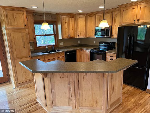 Behind the pines on a sprawling 1.2 acres is the hidden gem of your dreams! Run, play and enjoy the XL Open Space w/ underground fencing for pet safety! Redesigned kitchen/dining/living area features Open Floor Plan; Versatile 2 level island perfect for entertaining, homework or conversation; Rich hickory hardwood custom cabinetry and flooring; plus Convenient walkout to huge deck with steps to bkyd. Two large BDRMs & full bath on upper LVL w 2 BDRM & REMODELED 3/4 Bath below. NEW LVP flooring throughout LL in 2018. Family room w Brick FPL dry bar and walkout to patio. Oversized laundry utility room. Furnace and ALL KTN Appliances updated in 2010. NEW Water heater 2015. Several windows updated & much of siding painted/upgraded to Engineered Wood 2015-2018. NEW Roof Soffits and Gutters 2018. NEW LVP in upper bedroom 2021. NEW Central AC 2023. Oversized 3 Car heated/insulated garage & TWO sheds for tools & toys. 1 YR home warranty. EZ access to 35W Park& Ride, Shopping & Restaurants.