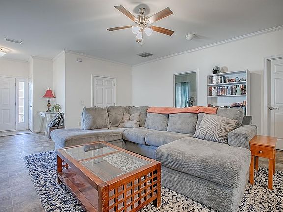 Situated in a quiet, well-established neighborhood in the heart of Gainesville, this charming home offers the perfect blend of comfort, convenience, and tranquility. Ideally located just a short drive from downtown and the University of Florida campus, this property is a haven for those seeking a peaceful retreat. As you approach the home, you'll be greeted by its impressive curb appeal, complete with a covered front entry and impressive private oversized homesite. The property is tucked away on a cul-de-sac street, backing onto a private treeline, ensuring a serene and secluded atmosphere. The privacy-fenced yard provides a secure and private outdoor space, perfect for relaxation or entertainment. Upon entering the home, you'll be welcomed by a bright and airy foyer, featuring double sidelights that allow for an abundance of natural light. A convenient coat closet is located just inside the entrance, keeping your belongings organized and within reach. The foyer opens up to a spacious living room, adorned with crown molding, and flows seamlessly into the dining room and kitchen, creating a beautiful open-concept layout. The kitchen boasts ample counter and cabinet space, stainless steel appliances, and plenty of storage. The living room is flanked by two guest bedrooms, which offer a versatile space that can be used both as bedrooms, a den, or hobby room. Each are favorably located making it easy to keep an eye on guests or enjoy quality time together. A guest bathroom is also in the hall, featuring a vanity and tub, providing a convenient and comfortable space for visitors. Down the hall, you'll find the primary bedroom, a serene retreat that's privately situated away from the rest of the house. The primary bathroom features a single sink double vanity and a shower, perfect for starting your day off right. Throughout the home, you'll notice that there's no carpet, creating a clean and modern look that's easy to maintain. The overall layout of the home is designed to be functional and comfortable, with plenty of natural light and a sense of openness that makes it feel spacious and inviting. Whether you're looking to upgrade your current lifestyle or simply seeking a fresh start, this home is the perfect place to call your own.