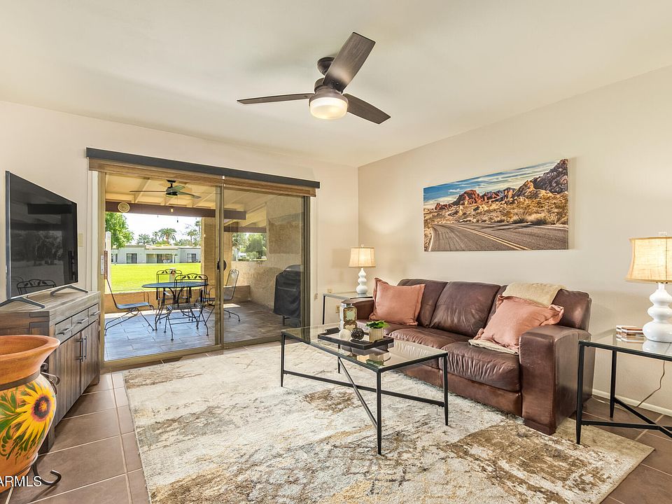 Beautiful GOLF COURSE patio home now available! - 2 split bedrooms & 2 baths. This property has been fully updated and is move in ready. Sueded matte finish granite kitchen counters, stainless farm sink and Samsung appliances plus a coffee/wine bar. Quartz bathroom counters and beautiful walk-in showers updated this year. New light fixtures and fans you will love and popcorn ceilings no more! Tile floors throughout. Entertain on your covered patio with a spectacular golf course view. Enjoy living in a conveniently located gated 55+ community with golf, restaurant, workout facility, pool and spa, pickleball, bocce ball. Activities all year.