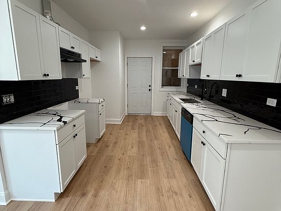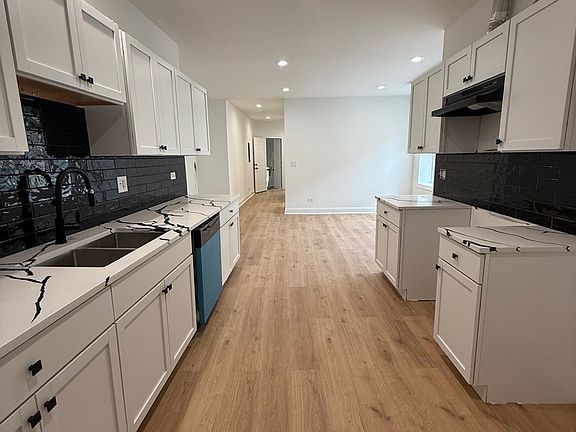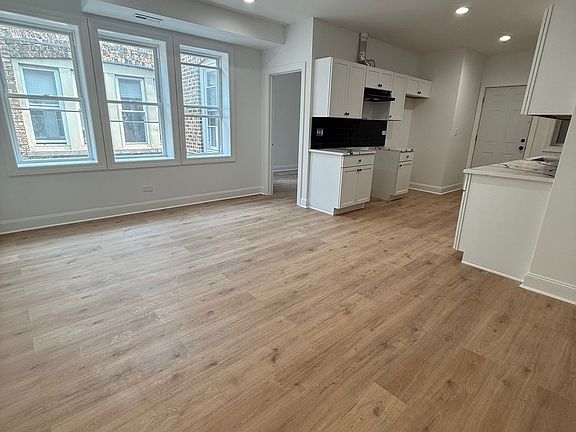 This beautiful 2 bedroom, 1 bathroom unit located in South Shore has been fully rehabbed in 2025. Be the first to live in this unit while everything is brand new! It is located on the top floor of a well-maintained 3 story building. The spacious, open concept living area is framed by large windows providing an abundance of natural light. The contemporary kitchen has white shaker cabinets, a sleek black tile backsplash, and an island perfect for entertaining or dining. The large bathroom keeps the same modern black and white color scheme. It has central air and there is laundry in the building. You will be minutes from Lake Michigan, Jackson Park, the South Shore Cultural Center, and easy transportation via CTA and Metra. Photos are of a similar unit inside the same building.
