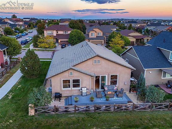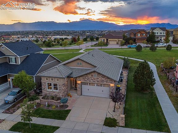 Perched on a premium mountain-view lot, this charming stucco, stone, and tiled-roof ranch will completely mesmerize you with its exceptional Front Range views from Pikes Peak to Cheyenne Mountain. The sunny and bright great room seamlessly brings the outdoors in with expansive windows and a glass slider to maximize panoramic views. Enjoy Colorado sunsets and outdoor entertaining on a composite deck that backs to open space and walking trails. The well-organized, gourmet kitchen features stainless steel appliances, leathered granite counters, marble tile backsplash, a pantry, and a breakfast bar. Mountain views and gorgeous LVP flooring continue in your primary retreat. The 5-piece ensuite bath features a custom, boutique-style walk-in closet and cedar-lined floors. Architectural details like raised, clerestory windows in the office create visual interest. An adjacent full bathroom, linen closet, and 3rd bedroom complete the main level. Downstairs is a spacious family room, 4th bedroom with a walk-in closet, a full bath with a double vanity, and a separate tub/shower and toilet room, plus a 5th bedroom used as a home gym, including a treadmill, rubber-mat flooring, a wall-mounted TV, and another walk-in closet. The laundry room contains a washer, dryer, upright freezer, and a dual-rack storage system that doubles as a second pantry. This thoughtful approach to custom organization extends to the garage with a butcher-block workbench, roll-out stainless storage carts, matching overhead storage bins, tower units, and ceiling racks to optimize vertical space. All of these extras, plus low-maintenance landscaping on a drip system, make this truly a lock-and-leave property. The BLR community offers bonus amenities like pickleball, tennis, pools, open space trails, summer concerts in the park, and easy access to restaurants, Peterson, and Shriever AFB. If you've been holding out for the perfect Colorado ranch with amazing mountain views, this is your moment.