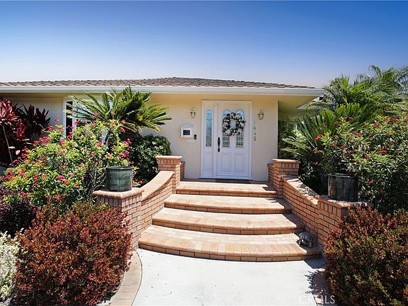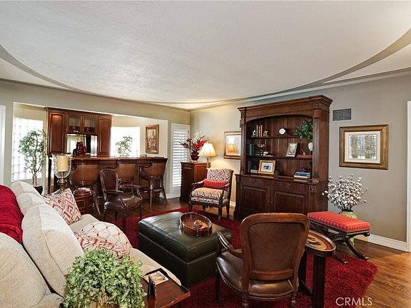 Meticulously maintained and manicured custom home in desirable Orange Estates including a beautiful 1 bedroom unit over 4 car garage. This lovely corner home is move in ready! Large formal entry opens to spacious living room with custom wet bar area. Wood shutters adorn the bay window, the ceiling has a unique design, combined with a glass brick wall and wood flooring. Formal dining room has a built-in wet bar with wine area, bow window. Gourmet kitchen has built in refrigerator, microwave, and double ovens and granite counters and beautiful tile floors. Cozy family room has gas burning fireplace. Remodeled baths and spacious bedroom. One bedroom is currently used as an office with built in desk and cabinets. This home has tons of custom cabinetry and closets for optimal storage. Beautiful covered breezeway leads to outside laundry and garage. Above the 4 car garage is a spacious 1 bedroom unit with living room and kitchen which is approximately 600 sq. ft. It has central air and heat.. Adjacent to the unit is a large storage area ( approximately 200 sq.ft.). This space can be utilized as a 2nd bedroom for the upstairs unit!