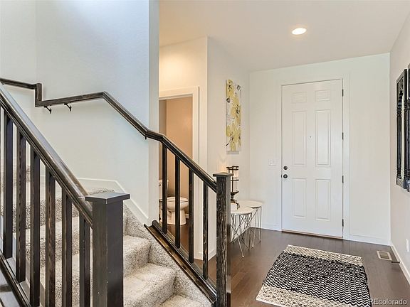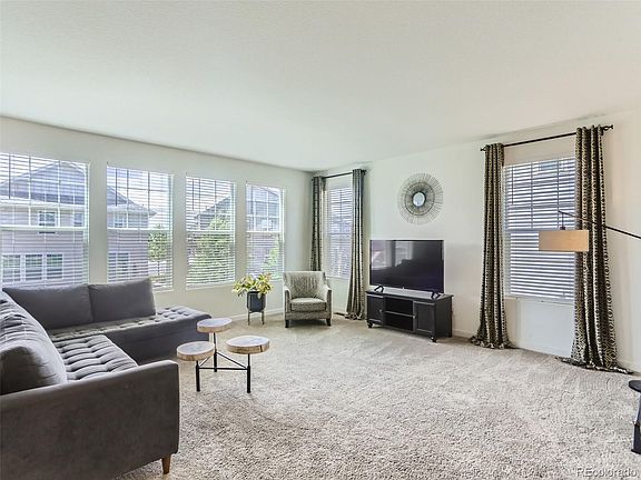 Welcome to a pristine home on a hilltop featuring a top-notch kitchen, open floor plan, loft, his/hers closets in the primary bedroom, large deck, endless natural light, and peeks of mountain views. Entertain on the main floor with a large open concept highlighted by the well-appointed kitchen boasting Corian counter tops, a double oven, a gas cooktop and stainless steel appliances. Lounge with family and friends on the sprawling deck with ample space for seating and grilling. Retire upstairs to a family room in the loft and your master suite featuring two closets and sinks, and complete your laundry without climbing stairs! All appliances included! Just two doors down from the park and playground. Nearby shopping, golfing, schools, and easy access to E470 to DIA and Parker. Don't miss it!