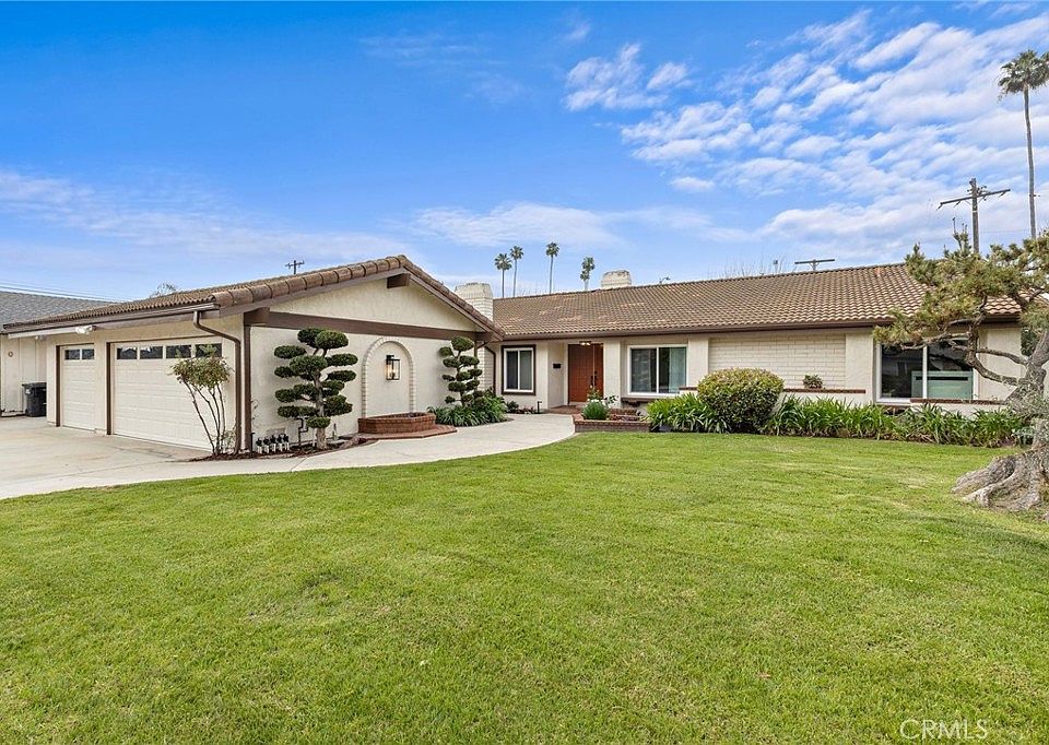 A perfect blend of comfort and elegance in this 2538 square-foot single story ranch style home, which offers exceptional indoor & outdoor living space. The appeal of this completely remodeled ranch style home begins immediately as you approach. The thoughtfully-designed floor plan features stunning upgrades throughout including laminate wide plank flooring, custom baseboards, recessed lighting, a high beamed ceiling in the family room, 2 fireplaces, new interior Craftsman style 2 panel doors with new hardware, and new windows and sliding glass doors throughout the home. The gourmet kitchen features a farm sink with new slow closing shaker cabinetry, quartz countertops, under-counter lighting, pantry, and a wine refrigerator. The large primary bedroom features a remodeled bathroom with dual sinks, quartz counters tops, shower, mirrored closet doors, and upgraded lighting fixtures. The two secondary bedrooms are large with an abundant amount of closet space. A large linen and coat closets line the hallway. The secondary bathroom boasts custom cabinetry with dual sinks, a bathtub/shower and neutral tile flooring. A well-appointed laundry room offers a lot of additional storage, a sink, and convenience. The stylish powder bath, and a three-car garage with ample storage, complete this well-designed home. The backyard features 2 patio spaces, a large grass area and is perfect for entertaining. This beautiful remodeled home won't last!