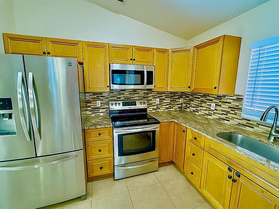 Granite countertopsWhite vinyl privacy fenceOpen floor planCeramic tile flooringStainless steel appliancesGlass tile backsplashSolid wood kitchen cabinets