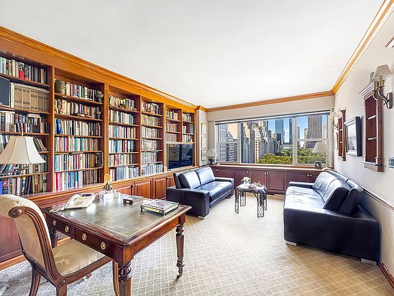 Entered from a semi-private landing, 14A welcomes you with a gracious central gallery glimpsing dramatic postcard views of Central Park through the living room's wall of windows. The living room is adorned with intricate crown molding, handsome built-ins and tasteful custom millwork throughout. Immediately adjacent to the living, the library continues the glorious views over Central Park and the surrounding medley of prewar and modern architecture. Originally a second park-facing bedroom, the library has an en-suite marble bathroom with a stall shower as well as a large walk-in closet and can easily be restored as a full-time bedroom, per your needs.