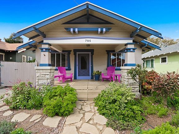 Calling all Bungalow and gardening lovers. This bright and airy Craftsman home has tons of vintage details including crown molding, a built-in buffet in the dining room and hardwood floors throughout. The home also has forced air and heating. The updated kitchen has plenty of cabinets, a separate pantry, tile counters, painted wood floors, and a glass-paned door that opens to an amazing back yard. The bathroom offers plenty of counter space and a large soaking tub bathed in light from a wall of glass block. The oversized master bedroom features a cozy sitting area with a gas fireplace to take the chill off cold evenings, a walk-in closet and beautiful French doors leading to an outdoor sanctuary. Enjoy lazy afternoons in one of the several seating areas, plant pots in the garden shed, grow your own vegetables and flowers in one of the many raised beds, or throw a dinner party under the covered patio at the rear of the yard. There is an additional, detached unfinished room with sink and toilet that could be a potential home office, artist studio, or private guest suite. The long driveway provides plenty of off-street parking and the detached garage includes laundry hook-ups. This home features upgrades including forced air heat and central air conditioning.