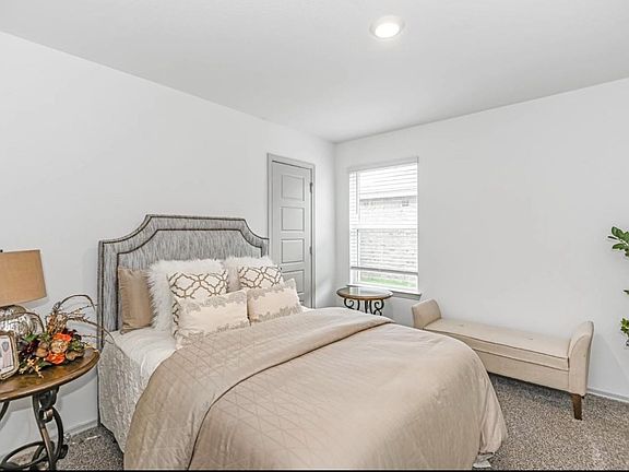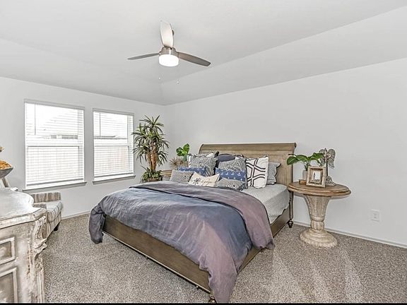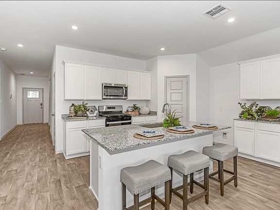 The Cali plan is a one-story home featuring 4 bedrooms, 2 baths, and 2 car garage. The long foyer with an entry coat closet leads to the open concept kitchen and breakfast area. The kitchen includes a breakfast bar with beautiful countertops, stainless steel appliances, corner pantry and opens to the family room. The primary suite features a sloped ceiling and attractive primary bath with vanities, and a spacious walk-in closet. The standard rear covered patio is located off the breakfast area. This home includes our HOME IS CONNECTED base package which includes the Alexa Voice control, Front Doorbell, Front Door Deadbolt Lock, Home Hub, Light Switch, and Thermostat.