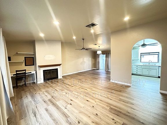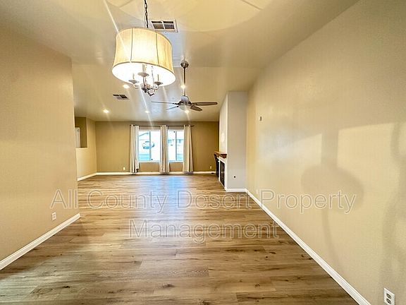 Spacious 3BR/2BA unfurnished home available for long term lease in Bermuda Dunes. This home features a large living/dining area with fireplace, ceiling fan, and luxury vinyl plank flooring. Kitchen with all appliances included and interior laundry room with washer/dryer which opens out to the huge, fenced yard and covered patio. Large Master bedroom suite with mirrored closet doors and ensuite full bath. Two additional bedrooms and attached two car garage. Gardening services are included in the rent. Tenant to pay all utilities including a solar charge of $150 per month.