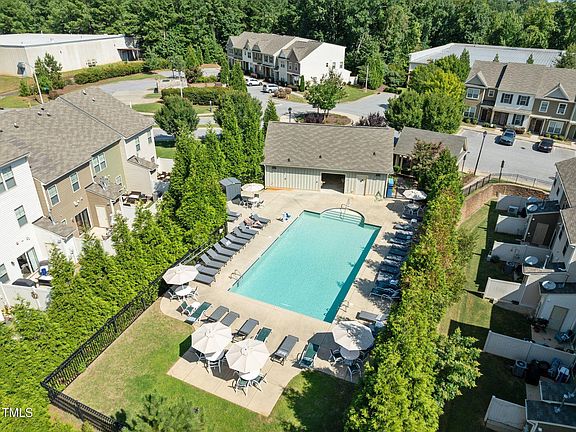 Original builder binder available! Landscaping work order just completed for more of that beautiful natural light you won't get elsewhere! This 2 bed, 2.5 bath home offers real hardwood floors, a spacious open-concept layout, and TONS of natural light. The kitchen includes granite counters, stainless steel appliances, a gas range, center island, and bar seating. New carpet just installed upstairs. New water heater. New bathroom and kitchen fixtures/hardware. Each bedroom has a private en-suite bath; the primary suite features double closets, vaulted ceilings and a soaking tub. Enjoy a private, fenced patio, HOA-maintained landscaped corner lot, and exterior storage. Washer, dryer, refrigerator all included! Community includes a pool, exterior maintenance, landscaping and lawn care. Located minutes to I-540, RDU, shopping, dining, and greenway trails. Rental permitted community (subject to cap). Contact co-list agent (Christine 252-550-2248) for credits, financing incentives and details.