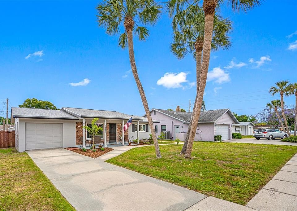 Welcome to “3 Palms at Ridge Road" in Seminole, Florida 33772. Where location, convenience, and true Florida Living are available to you in one of the most desired zip codes in Pinellas County. You don't want to miss this 2 Bedroom, 2 Full Bath charming and well-maintained solid block home with plenty of natural light. You are invited by a friendly front patio, beautiful landscaping, which includes mature tropical shrubs and fruit trees, along with 3 tall swaying PALMS, that create an authentic Florida feel. Once inside, you will admire the recently polished original Terrazzo flooring. If Terrazzo is not your preferred flooring, changing it to your taste is extremely simple! The home's interior and exterior were professionally painted in April 2024 and professionally cleaned. The layout features ceiling fans throughout, a well sized living room and dining area, two spacious bedrooms with built-in closets, a stylishly updated primary bathroom (2023) with ample linen storage, and an updated kitchen (2023) with a large pantry, newer stainless steel appliances, and high-quality glass-front cabinets. A desirable feature of this home is the large laundry/utility room, which provides ample storage space and includes a full-size LG washer and dryer (2021) and a wonderful white cabinet that holds all your shoes and will be conveyed with the sale of the property. The single-car garage has been partitioned to make room for a complete 2nd bathroom, without compromising on additional storage or workspace. The 2nd Bathroom (2021) has been designed with great taste and professionalism. From the attractive tiling in the shower area to the modern fixtures and vanity, it is evident that this is not just any ordinary 2nd Bathroom in a garage conversion. Additionally, the 2nd Bathroom and Laundry/Utility Room are properly ducted for HVAC, ensuring a comfortable environment at all times. For those beautiful days in Florida, you'll love spending time in your screened-in porch/patio with decorative flooring and a wood-beamed ceiling. You'll have plenty of privacy for entertaining guests, spending time with family, and letting your pets roam around in the fully-fenced backyard. A convenient sidewalk connects the porch/patio to the storage shed (Shed is the LIFETIME Brand 9.7" x 7.7"), so you can keep your shoes clean when you return to the house. Other property highlights within recent years include; Hurricane Impact/Low E Windows and Slider (4/2023), Roof in 2019, HVAC in 2016, Water Heater 2016, Updated Electrical Panel, a very spacious, well-built Outdoor Storage Shed, Screened Doors on both the Front and Back Porches, Security Cameras, Door Bell Security Cam, Window Treatments and 50 Amp Plug/50 Receptacle, Interlock Switch/Plate (2022) for safe Generator Hookup during power outages. 3 Palms at Ridge Road is situated in Flood Zone X, which means that no Flood Insurance is required, and there is NO HOA. The zip code 33772 is renowned for being "HIGH & DRY," known for its A-RATED SCHOOLS, is within walking distance to Seminole City Mall, has multiple shopping and dining options nearby, is only a few miles from Bay Pines VA, and is just MINUTES away from our award-winning SUNCOAST BEACHES! Schedule an appointment today to view this exceptional property! It's move-in ready and an ideal fit for first-time homebuyers, retirees, investors, seasonal residents, VETERANS, and anyone searching for affordable living in Pinellas County. See it today!