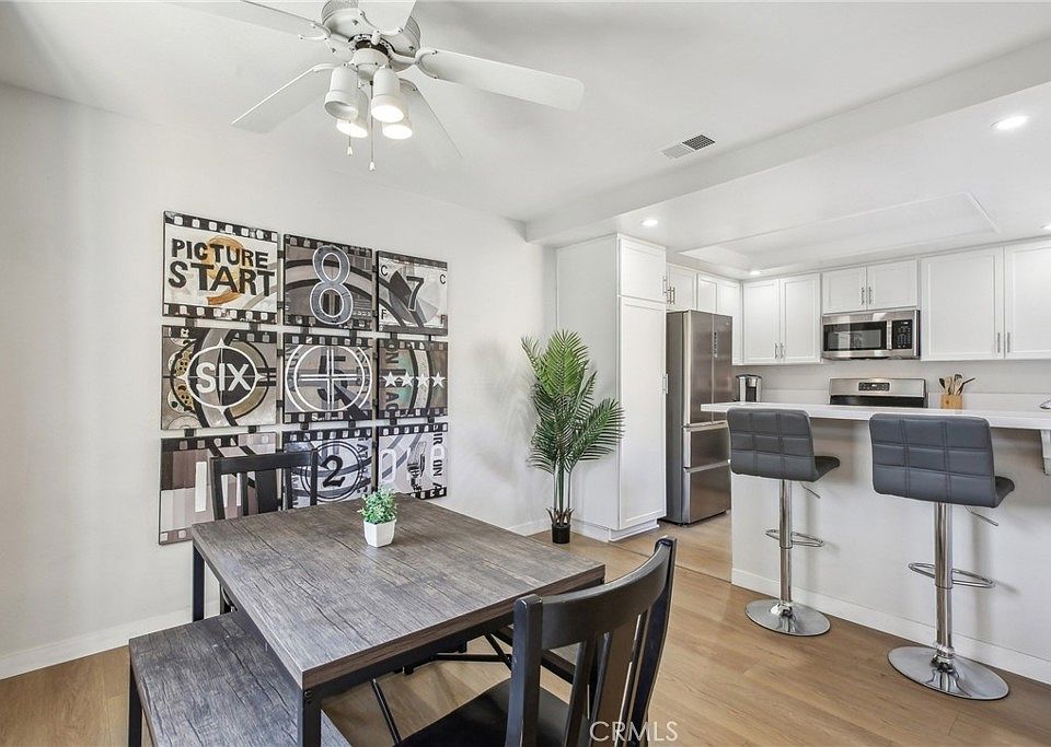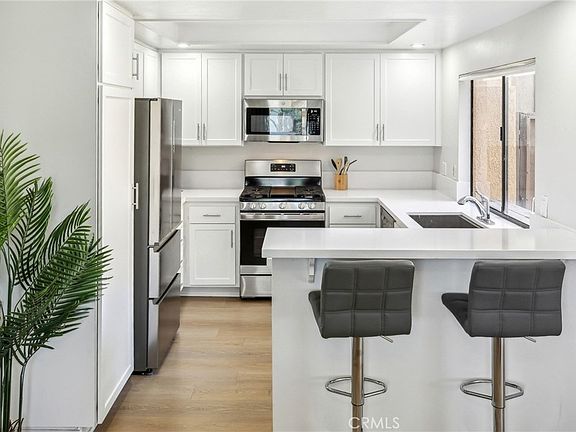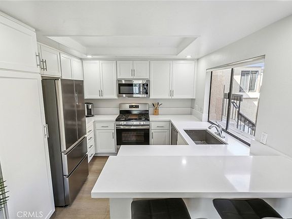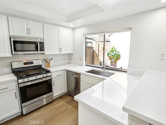 Welcome to the Millstream Community! This beautiful second level condo with 971 sq. ft. of living space boasts an abundance of natural light in every room. The home features two spacious bedrooms and one and a quarter bathrooms (other units have converted the 1/4 bath to a 3/4 bath), a large private gated patio, and a single car detached garage! As you enter the home, you are greeted by a cozy free standing fireplace, vaulted ceilings and luxury vinyl flooring. The kitchen was remodeled in 2023 with all new cabinetry, quartz countertops and stainless steel appliances. The primary bedroom features a large walk in closet and its own private sink area, and the secondary bedroom has mirrored closet doors. The stackable washer and dryer are conveniently located inside the unit and are included in the sale. There was also a new furnace installed in 2022 and a new water heater in May of 2023. Skylights and lots of windows give this unit a light and bright atmosphere. You will love the scenic pathways of this community with meandering streams and gentle waterfalls. This amazing gated community also offers a sparkling pool, soothing spa and a well maintained tennis court. There is plenty of guest parking throughout the community with no permits needed. In addition to being in close proximity to shopping, restaurants, and entertainment, this community is 5 minutes to the freeway and 10 minutes to the beach! You don’t want to miss this one!!!
