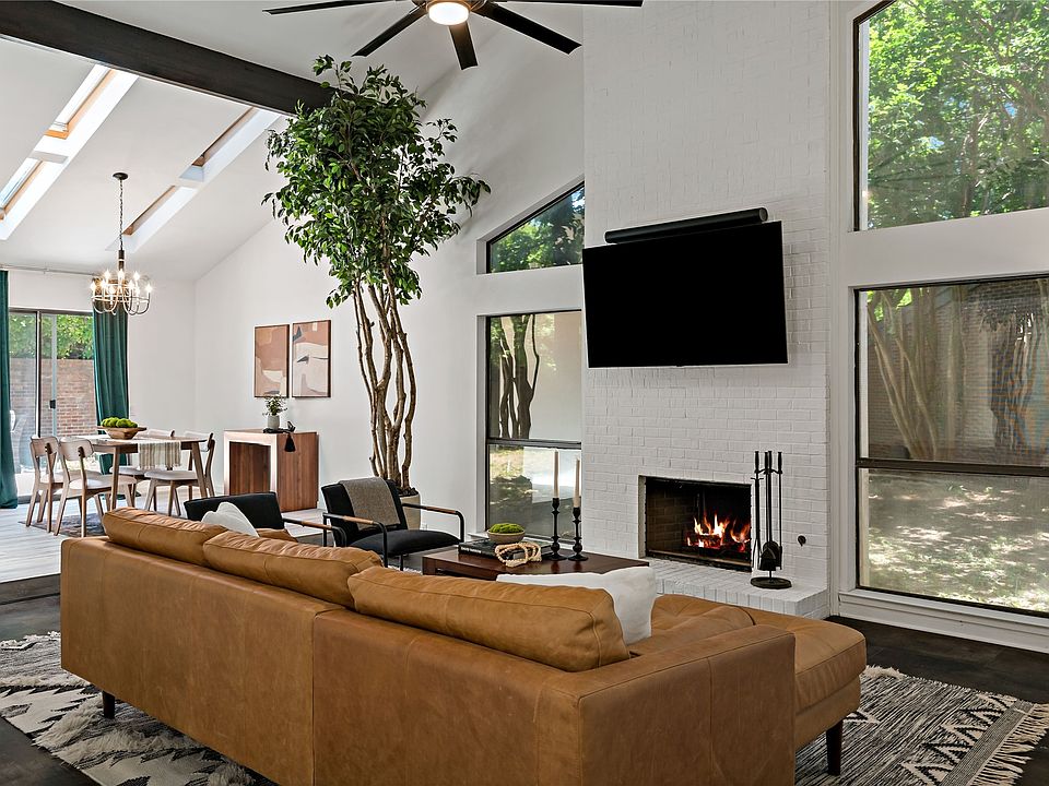 Welcome to this modern Lake Highlands one story home in the sought-after Richardson ISD, perfectly positioned minutes from White Rock Trail, retail & dining. Bathed in natural light from oversized windows & multiple skylights, this 3 bedroom home features expansive updates including kitchen, all 3 baths, & flooring. Large primary suite boasts sliding doors, skylights, a luxurious bath with a freestanding tub, & zero-step shower. An additional secondary bedroom includes a private en suite bath, with a split bedroom floor plan enhancing privacy. Dramatic living room impresses with vaulted ceilings, a floor-to-ceiling fireplace, & beams. Climate-controlled attic conversion (not in sqft) offers a versatile space for a home office or storage. Upgraded throughout and move-in ready, the home also features a generous patio perfect for entertaining and an enormous green space ideal for a pickleball court or pool. HOA takes care of basic front yard maintenance for added convenience.