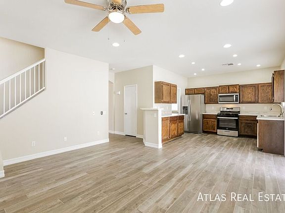 This 4-bedroom home, located at the end of a cul-de-sac, features tile and carpet flooring throughout. The kitchen offers solid-surface countertops with a seamless double sink, and the interior has been freshly painted. French doors in the downstairs living area open to a fully permitted office that can also serve as a 5th bedroom, den, or workout space. The spacious primary suite includes a large bathroom with a separate tub and shower accented by updated tile. All bedrooms are equipped with ceiling fans and lighting. The downstairs closet/pantry provides built-in shelving and ample space for organized storage. The backyard includes a built-in firepit, creating a great setting for outdoor enjoyment.