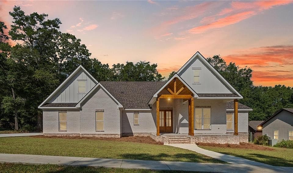 This custom new construction was completed in September 2025. This stunning new build features timeless white brick and stained accents, a vaulted front porch ceiling, and beautiful French double doors for the entry. It’s grand! Upon entry, you’re led into the designated foyer space and main living area. This home boasts an open-concept floor plan with 10-foot ceilings in the main areas. The gorgeous gas-burning fireplace is finished with warm-tone stone and a floating mantle. Let’s talk about the kitchen. It’s perfection. Featuring quartz countertops and a large island perfect for entertaining, as well as stainless appliances. But nothing beats the hidden walk-in pantry, perfect for hiding away all your small appliances and keeping your kitchen looking decluttered and beautiful year-round. My second favorite feature in this home would have to be the very generously sized laundry room. It has tons of cabinetry and countertop space, conveniently located next to the master closet. With direct access to the closet, it’s perfect for optimizing your efficiency with house chores. Next, we’re brought to the master en suite bathroom. It features his and her vanities, a freestanding soaker tub, and a separate shower. The master bathroom is perfectly designed, finished out with champagne-bronze hardware and neutral colors, giving it an elegant feel. There are three additional bedrooms in the split floor plan, sharing a bathroom. There’s also a half bath just for your guest. Right off the living room, you can enjoy a fully screened-in back patio overlooking a good-sized backyard. This home is bronze-fortified and also features a tankless water heater. It’s a brand new home located in Saraland School District. What more could you ask for this Christmas? Call today for a showing before it’s gone!