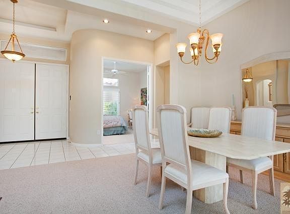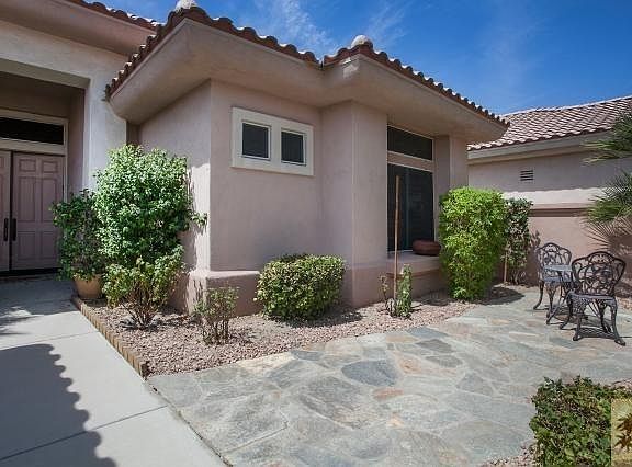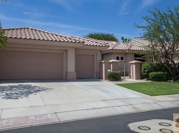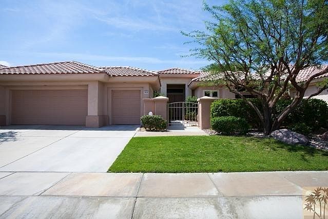 Reduced over $30,000. Lovely Emerald Estate model. Enter through a beautiful gated courtyard. Double door entry. Indirect lighting in entry. High, coffered ceilings in spacious living room/ dining room. Beautiful kitchen with huge center island with salad sink, easy to keep Corian counters, wonderful upgraded cabinets, triple pantry. Large family room adjacent to kitchen with eating area overlooking patio and garden. Door out to the lovely extended patio. Sumptuous master suite with gorgeous attached bathroom--double sinks, separate shower and tub, large walk-in closet. The guest bedroom is en-suite. Den/ office with double doors and adjacent to the half bath. Custom window coverings including plantation shutters. Lots of skylights. Two car plus golf cart garage.This home is move-in condition. Furniture may be purchased outside of escrow