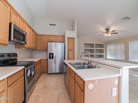 Updated 4-bed, 2-bath home perfectly situated on a corner cul-de-sac lot across from a small park—no HOA! Located near Cardinals Stadium, Glendale Community College, and with easy access to Loop 101, this home offers both comfort and convenience. Inside, you'll find 1,930 sqft of spacious living, featuring vaulted ceilings, smooth tile throughout, and newer AC and appliances. The eat-in kitchen with a breakfast bar opens to a separate family room and living room. Both bathrooms feature double vanities for added comfort. Step outside to a covered patio overlooking a beautiful backyard with artificial grass, gravel, and lovely plants—ideal for relaxing or entertaining. A wonderful move-in-ready home in a truly desirable location!