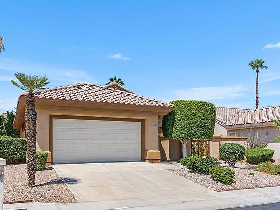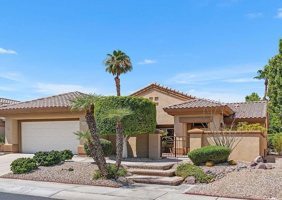 Sun City Palm Desert - Waterford Model | 55+ CommunityIdeally situated just a short walk from the Mountain View Clubhouse, this beautifully upgraded Waterford Model offers exceptional curb appeal and stylish desert living. Fresh exterior paint, low-maintenance desert landscaping, and interlocking pavers create a warm welcome, while the south-facing courtyard is perfect for enjoying sunny desert days.Step inside to a bright and inviting living room with sliding doors that lead to a spacious, fenced rear patio--ideal for entertaining or relaxing in privacy. The smart split-bedroom floor plan ensures extra privacy, with bedrooms and bathrooms located on opposite sides of the home. Elegant wood floors, plantation shutters, and quality window treatments are found throughout.The kitchen is a true highlight, featuring abundant counter space, upgraded cabinet doors, a gas range, newer stainless refrigerator, and upgraded countertops. The charming breakfast nook is surrounded by windows and opens to the patio, bringing the outdoors in.The primary suite includes a large walk-in closet, dual vanities, and a walk-in shower, offering comfort and convenience. An oversized indoor laundry room with a built-in desk provides a functional home office space, while the attached two-car garage features ample storage racks.Both bathrooms have been completely remodeled, and the kitchen has been tastefully upgraded. Offered fully furnished and turnkey, this home is move-in ready--just bring your toothbrush!A must-see opportunity to enjoy the best of Sun City Palm Desert living.