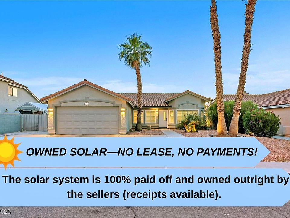 RV parking in front and behind the gate on a quiet cul-de-sac, minutes from the airport, Strip, shopping, and freeways. Open-concept living with vaulted 12-ft ceilings, all-new energy-efficient windows/doors, extra insulation, and all-new kitchen appliances with an oversized island. The primary suite has a renovated bath with dual sinks and a tiled shower. Backyard features a sparkling pool with automated phone-controlled equipment, new irrigation, automated lighting, paver patio, and full cover. Paid-off solar keeps bills under $20/month; EV hookup in garage.