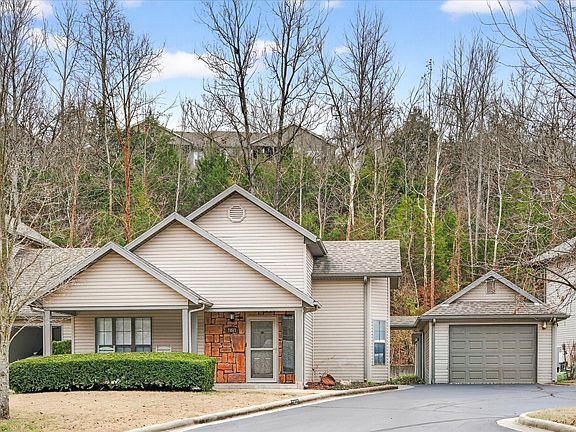 Nestled in the quiet, wooded setting of Cozy Cove, this beautifully finished Branson condo blends warmth, charm, and modern updates throughout. Step inside to an inviting living area with soaring vaulted ceilings, large windows, and rich wood-grain flooring that flows seamlessly through the main spaces. Decorative built in touches, updated lighting, and clean neutral tones give the home a bright, elevated feel from the moment you walk in.The kitchen stands out with crisp white cabinetry, granite counters, stainless steel appliances, a tile backsplash, oil-rubbed bronze hardware, and thoughtful shelving. The adjacent dining area features an arched window, custom banquette seating and statement lighting, creating a warm and elegant place to gather.The primary suite offers generous space and a beautifully updated bath with dual sinks, added cabinetry, and a luxury walk-in shower featuring floor-to-ceiling tile and gorgeous glassed doors. Secondary bedroom boasts glass sliders to the covered patio. Hall bath features same high-quality finishes; a soaking tub with glass surround, and granite vanity. A dedicated laundry/mudroom provides extra storage and convenience, while the covered back patio overlooks mature trees and natural greenspace -- a perfect, private spot for morning coffee or evening unwinding. Glorious gardens along the space host perennials, blooming with beauty every spring.Outside, you'll appreciate the detached garage, offering secure parking and valuable storage just steps from your front door. The Cozy Cove community is beautifully maintained and tucked away among the trees, yet ideally located just minutes to Branson Landing, Lake Taneycomo, dining, shopping, shows, and outdoor recreation.Whether you're looking for a low-maintenance full-time home, a peaceful second residence, or a retreat with upgraded finishes, this condo delivers exceptional comfort and convenience in one of Branson's best-kept secret communities.