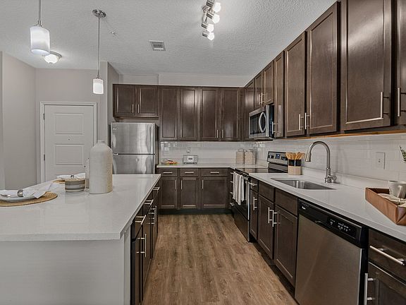 One-Bedroom Apartment Home with Carpeting, Ceiling Fan, Disposal, Wood-Style Flooring, Quartz Countertops, Air Conditioner, Balcony, Washer/Dryer, Refrigerator, 9 Foot Ceilings, Designer Plank Flooring, Garden Tubs, 2 Inch Blinds, Spacious Closets, Double Vanities, Stainless Steel Appliances w/Glass-Top Stove, 42 Inch Cabinets, Microwave, and Dishwasher