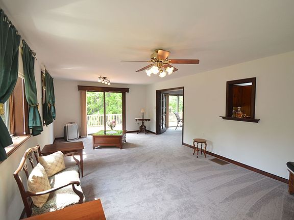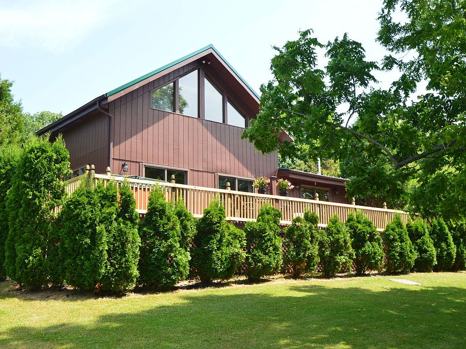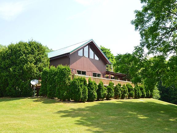Spectacular Country Contemporary situated on 11 Acres.This is your own private retreat .Cozy and Comfortable The home Boasts an Open Floor Plan w Vaulted Ceilings and exposed Beams.There is a master bedroom on the main Floor Updated Kitchen and Open living and dining rooms.A spiral Staircase brings you to the Lg loft with 1/2 Bath. Huge Deck w Hot Tub overlooking the park like yard w Stocked Pond. Lg 2 Story Building w ,work shop area, Second floor access and Large Sliding Door for RV OR Boat Storage.Updates include Central Air,Furnace,Metal Roof ,Freshly Painted inside and Out and New Carpet.