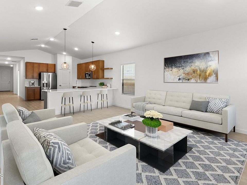 Last Home Available Ready for IMMEDIATE Move-in!!! Nestled in the beautiful Ambra community in Glendale, this spacious single level 5-bedroom Orinoco plan home is expertly designed with our signature Loft inspired interior selections. The open kitchen boasts 42'' cabinets, quartz counters and a walk-in corner pantry. The expansive great room, with its vaulted ceiling, creates an inviting space for relaxing or entertaining family and friends. Enjoy the tranquil oversized primary suite with private entry and generous walk-in closet plus a resort like bath. Beautiful faux wood tile enhances the living areas, while cozy carpet in the bedrooms adds warmth. Don't miss your chance to own this amazing home, a perfect blend of style and comfort! ~~Ask about Special Financing Options Available!!!