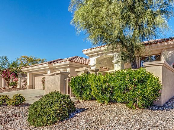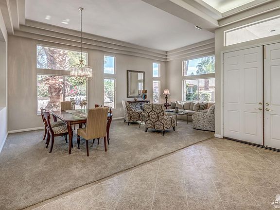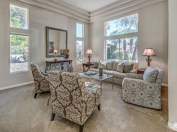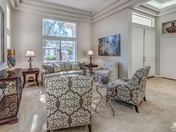 This beautiful Marquis model has 12 ft triple coffered ceilings in the living area, with up-lighting for an elegant effect. There is a fabulous upgraded kitchen with white painted cabinets, stainless appliances, and gorgeous slab granite counters. The interior paint and carpet are newer and since the home is a vacation home, everything has hardly been used. Plantation shutters and Silhouettes cover the windows and the cozy fireplace warms the family room off the kitchen. The large laundry room has a sink and lots of cabinets. The master bedroom views out to the lush back yard through the bay windows. Master bath has separate vanities, a jetted tub, and a walk-in shower and the closet is huge. There is a guest suite as well as a private guest room/office with double doors. The garage has storage cabinets and 2 new HVAC units. The oversized lot adds privacy and light and the backyard has covered patio, turf grass and is easy to maintain. Furniture negotiable outside of escrow.