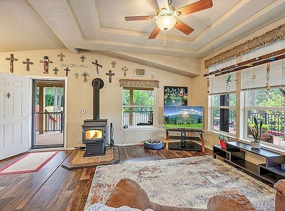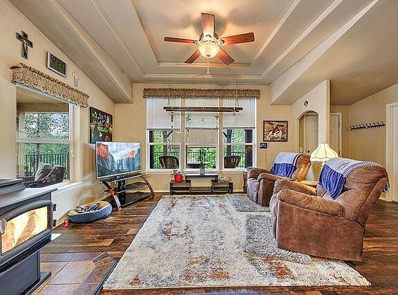 Beautiful home in an absolutely beautiful setting. Home has been meticulously maintained. Home offers1647 square foot, 2 bedrooms, 2 full bathrooms plus an office that could be used as a third bedroom. Nice open kitchen with hickory cabinets and pantry, with views of the fenced back yard, Primary bedroom has an ample walk-in closet and primary bath has a shower and nice soaking tub. The heating and air system was updated April of this year. Outbuildings include a 35 X 45 carport/shop, 16 X 35 RV barn w/power and water and two additional 20-foot storage containers. The deck offers a peaceful sanctuary to enjoy the lovely view. The landscaping is gorgeous with raised flower beds and shrubs which are all on irrigation with timers. After dark, low voltage night-scaping illuminates the flower beds and trees. 11.24 acres offers half meadows and half wooded area. Property has an electric gate and is fenced and cross fenced. Words cannot do this lovely home and property justice.