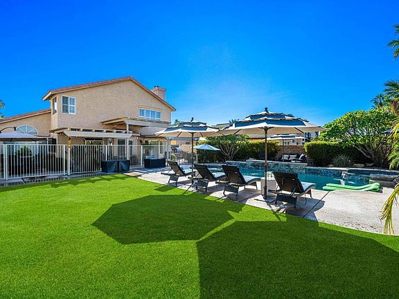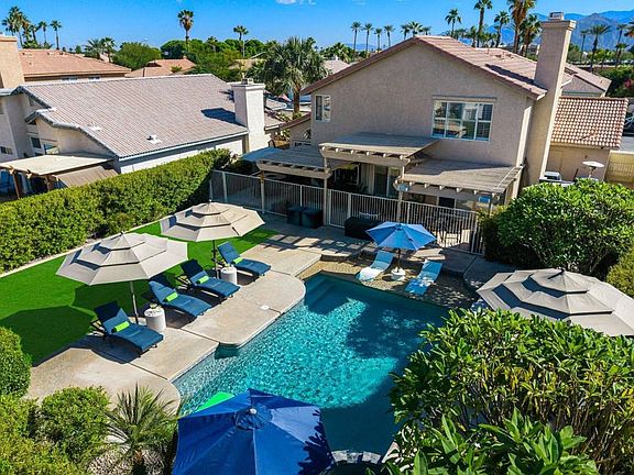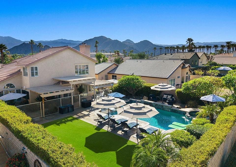 Welcome home to this inviting and beautifully updated 4 bedroom, 2.5 bathroom residence in the desirable Acacia at La Quinta community. Designed for effortless indoor/outdoor living, this home offers stunning mountain views and a private backyard retreat complete with a sparkling pool and spa, lush green lawn, a built-in BBQ and pizza oven, and a large covered patio ideal for relaxing with friends.Inside, the remodeled kitchen features granite countertops, stainless steel appliances, and a charming greenhouse window that fills the space with natural light. An open living/dining area anchors the main level, while a private lounge off the kitchen showcases an upgraded fireplace, wet bar, and wine storage -- a perfect space to gather and unwind.The primary suite includes a double vanity and walk-in closet, while three additional bedrooms provide flexibility for guests, a home office, or hobbies. Additional features include an automated lighting system, interior and exterior audio system, updated guest bathrooms, and plantation shutters throughout.With no HOA fees and just minutes from world-class golf, tennis, pickleball, hiking, dining, shopping, and Acrisure Arena events, this Acacia at La Quinta home delivers the quintessential desert lifestyle.