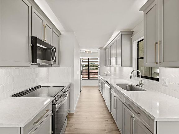 One or more photo(s) has been virtually staged. RENOVATED COASTAL CONDO WITH WRAPAROUND WATER VIEWS IN GATED COMMUNITY JUST MINUTES FROM ST PETE BEACH | Set within the gates of Sailboat Key, an exclusive resort-style condo community, this spacious corner-unit condominium offers 1,445 square feet of refined living space with two bedrooms, two bathrooms, and sweeping wraparound balcony views of the Intracoastal. Enjoy custom-curated designer details which include new cabinetry, countertops, fixtures, lighting, flooring and more. The open-concept living and dining areas are anchored by new waterproof laminate flooring and incredible natural light streaming through sliding glass doors. The beautifully remodeled kitchen features Silestone countertops, oat-colored cabinetry with built-in under-cabinet lighting, and stainless steel appliances, creating a sophisticated yet welcoming space for cooking and entertaining. Both bathrooms showcase floating vanities for a sleek, modern touch, while the bedrooms feature custom built-in closet systems for effortless organization. The primary suite offers a spacious retreat with a walk-in closet, private balcony access, and an ensuite bathroom. Additional highlights include hurricane shutters for peace of mind, in-unit laundry, assigned covered parking, and a balcony ideal for morning coffee or evening sunsets. Life at Sailboat Key is resort-style and carefree. Residents enjoy 24-hour guard-gated security, a heated waterfront pool and spa, a fitness center, clubhouse, tennis courts, and social spaces. The community also offers marina access with a seawall and beautifully landscaped grounds. Ideally located just minutes from St. Pete Beach, Treasure Island, and downtown St. Petersburg, this condominium offers the perfect blend of comfort, security, and waterfront living.