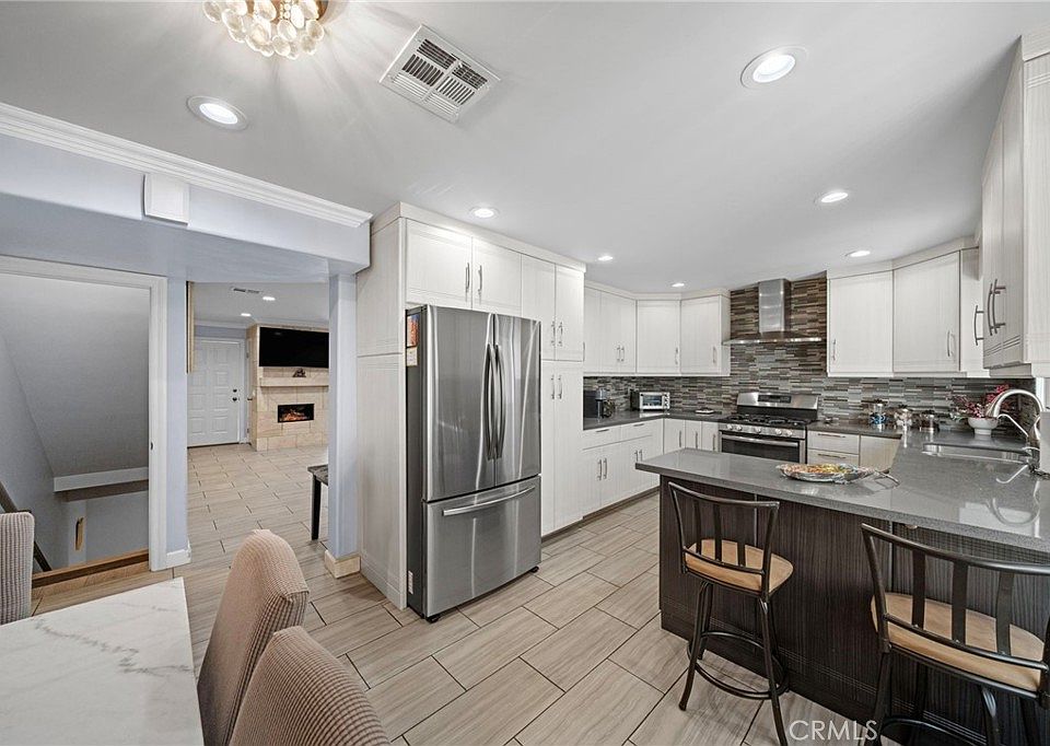 The modern kitchen features stainless steal appliances, ample storage space, and a convenient breakfast bar, making it a dream for any aspiring chef. Adjacent to the kitchen, the dining area provides a lovely space for enjoying meals and creating lasting memories.