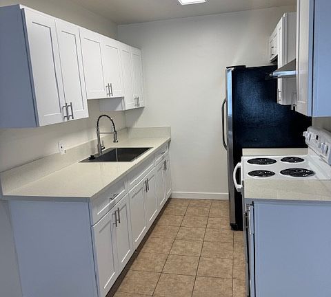 Brand-new kitchen with modern cabinets, stylish sink, and sleek faucet