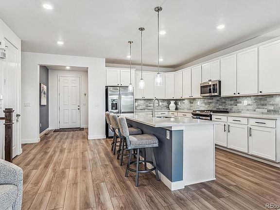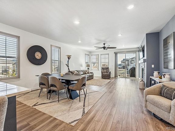 Welcome to this beautifully upgraded patio-style home in the sought-after Sterling Ranch Community! Designed for easy main-floor living, this 2 bedroom, 2 bathroom home offers an open floorplan, featuring a living room with a modern stone fireplace and elegant plantation shutters. The space flows seamlessly into the dining room and kitchen, making it perfect for both relaxing and entertaining. The stunning kitchen includes white cabinetry with under-cabinet lighting, quartz counters, stainless appliances, pendant lighting, and a spacious island that provides plenty of seating.
