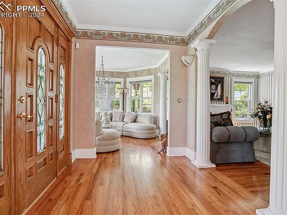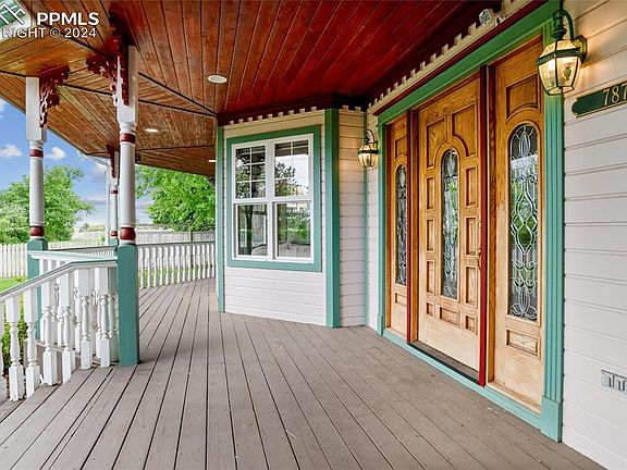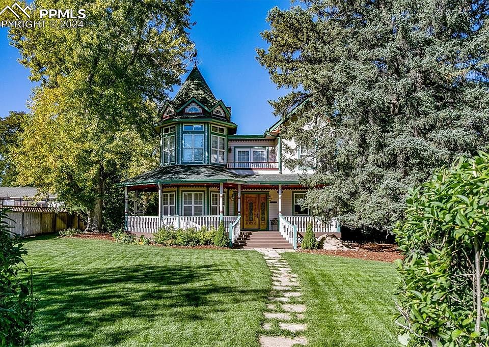 The community has long called it the “Crown Jewel of Louviers”. Douglas County calls it one of the most, if not the most unique home in the county. I call it absolutely amazing but today you can call it yours. With its sprawling front lawn, quaint wrap-around porch & undeniable sense of nostalgia, you'll truly fall in love w/this captivating 1915 Victorian estate. The front entry framed by white columns & a well-dressed butler welcomes you into the foyer while the octagonal-shaped formal living room, elegant dining room, charming arch doorways, natural hardwood floors & large living room w/vintage-style fireplace adds another layer of character & charm to the home's design. The chef’s kitchen features knotty pine cabinets, high-end granite countertops, decorative backsplash, gas stove & breakfast bar for enjoying tea w/friends. Step into the entertainment room w/floor to ceiling stone fireplace, curved granite countertop bar, natural stone floors, circular ceiling w/wood beams & spectacular wall of windows. The romantic master BR suite provides a sanctuary for relaxation w/sitting area next to a wood burning fireplace and wrap around balcony to the lush gardens & mountain views. En suite master bath features marble counters, sunny skylight, dual sinks, walk-in cl & large soaker tub. To add a touch of artistic flair, the office showcases a unique circular ceiling w/hand-painted murals. Park all your cars in the 65 X 24 insulated, heated garage/outbuilding w/same size loft above for additional storage/space. Within the walls of a black wrought iron fence, you’ll find the most enchanting private backyard you've ever seen w/professional landscaping, newer 1500+ sq ft maintenance-free deck, pergola w/outdoor fireplace and stunning mountain views. Located in a historic small town, Louviers offers the best of both worlds – the serenity of small-town living w/easy access to I-25, C470, restaurants & shopping. This home is truly a remarkable timeless treasure.