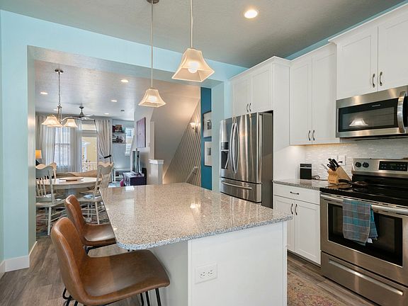 Beautiful townhome with unique features and designer upgrades. Located close to Bangerter and Mtn. View Corridor for easy around the valley access. New carpet on stairs, lovely upgrades to backsplash, cabinets w/under-cabinet lighting. Professionally built built-ins maximize space. Decks on both East and West allow for amazing light throughout. Garage is 2+ deep, has MOVABLE insulated wall on wheels which allows for a wonderful main level mud room, storage area, or workout room. (see photos). Seller is original owner and pride of ownership shows through! Click on tour button above for a virtual showing.