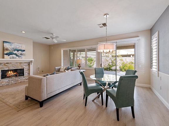 Sun City Palm Desert St Maarten Model 1664 SqFt. Move-in Ready! 2Bd/2Ba + DEN! Large Open Great Room with stacked stone fireplace makes this a perfect desert home for entertaining. Large planked Laminate floors finished with 5'' custom baseboards and Plantation Shutters are throughout. The Kitchen has newer stainless appliances, white cabinets with lower pull-out shelves, a pantry and breakfast bar with pendent and LED canned lighting all have ''Decor'' switches. The extended covered patio, with built-in BBQ, water feature and artificial turf offering you low maintenance landscaping. Attached 2 car garage w/ Brand new Epoxy floors and newer swamp cooler has direct and easy access to the kitchen. Sun City has it all for you! 3 beautiful clubhouses, Restaurants, two 18 hole Golf Courses, Miniature golf, Social Clubs, 2 State Of The Art Fitness Centers, Post Office, Fishing Lake, Community Pools, Tennis, Pickle Ball and Billiards.