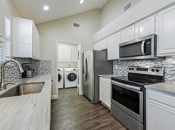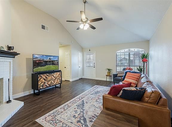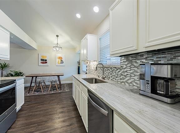 Updated and ready for move-in! Kitchen features white cabinets, granite countertops, mosaic tile backsplash, single basin sink and stainless steel appliances. Kitchen refrigerator stays with property. Bathrooms are light and bright with recent new cabinetry, granite counters and frameless shower enclosures. Vaulted ceilings. Large covered patio with fenced backyard. 2-car garage. Located close to Hwy 121 and Frisco shopping.