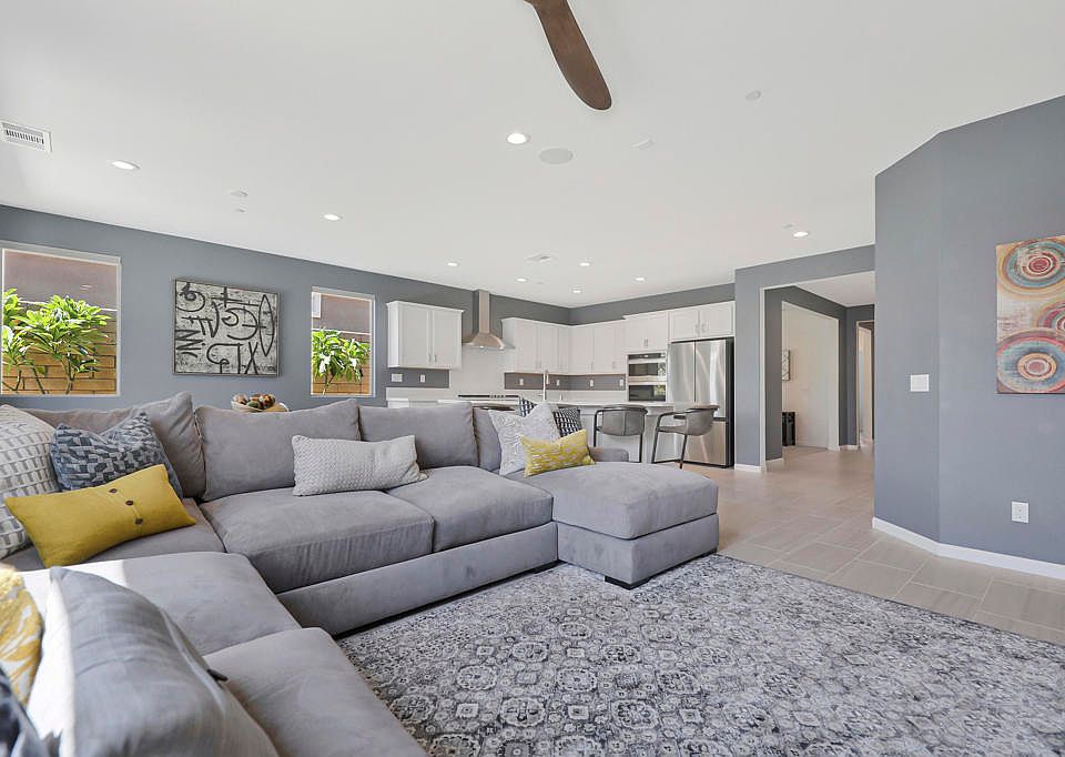 Innovative and Contemporary, this Comfortable Modern Design Features High Ceilings, Open Floor Plan, Light Porcelain Tile Floors, and Immaculate White Cabinetry and Countertops throughout. Gourmet Kitchen with Spacious Countertops, Upgraded Whirlpool Stainless Appliances, Island with Bar Seating and Pantry. Primary Bedroom with En-Suite Bath and Luxurious Oversized Walk-In Closet. Secondary Guest Room Privately Located away from Primary. This Popular Silver Creek Plan also features a Generous Sized Office which could easily be made into a Third Bedroom. Surround Sound and Motorized Shades in Great Room. Glass Sliders Open Great Room/Dining/Kitchen to Covered Patio--Perfect for Indoor Outdoor Entertaining with Family and Friends. Professionally Designed Backyard Landscape with Lighting and Irrigation. Owned Solar Panels. So many upgrades and Move-in Ready Furnished for you! Seize the Day and get into the Fun that this Community has to offer! Community Club House, Pool, Spa, Fitness, Pickle Ball and Bocce Court!