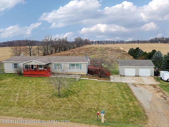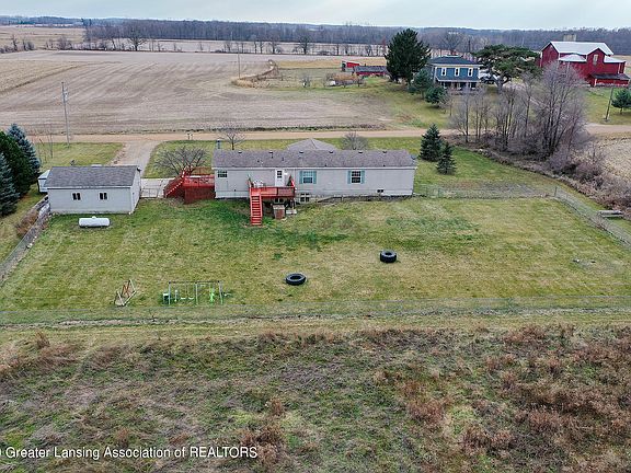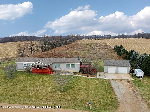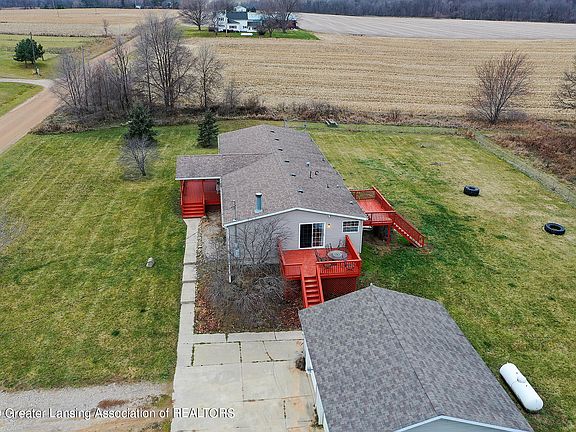 Price reduced!! Home Warranty for 1 full yr! A 3 bedrm 2 bath ranch home on 5.92 acres. The rear acreage has been planted w/clover 150 seedlings - great for enjoying nature or hunting. Lots of curb appeal w/the large covered front deck. Notice the side deck and rear raised deck to the fenced yard. Vaulted ceilings, large rooms, woodburning fireplace central air. Spacious kitchen w/an island bar, lots of cupboards counter space. Primary suite features a walk in closet, a sitting room w/french doors, master bath w/a garden tub, separate shower double sinks. Two more bedrms share a hall bathrm. Enjoy the raised rear deck with a view of the fenced area country acreage. Full basement w/poured walls. Wired for a generator. 2.5 car garage. Extra 8x25 concrete slab. Easy commute to Ovid and M-21. Warranty!