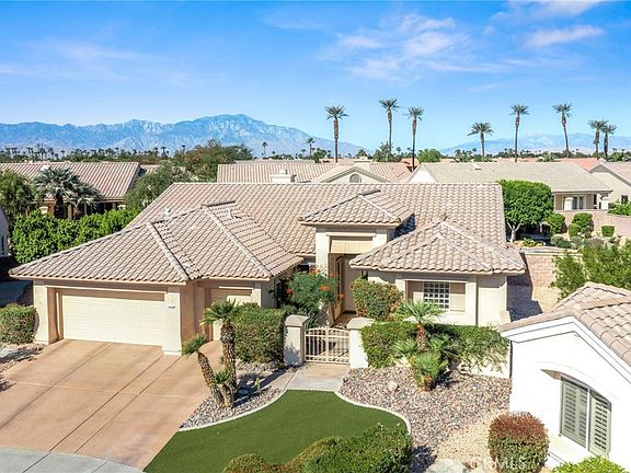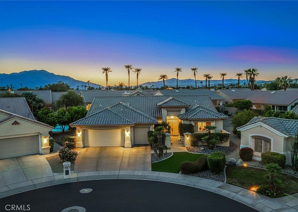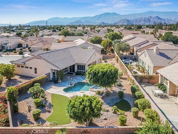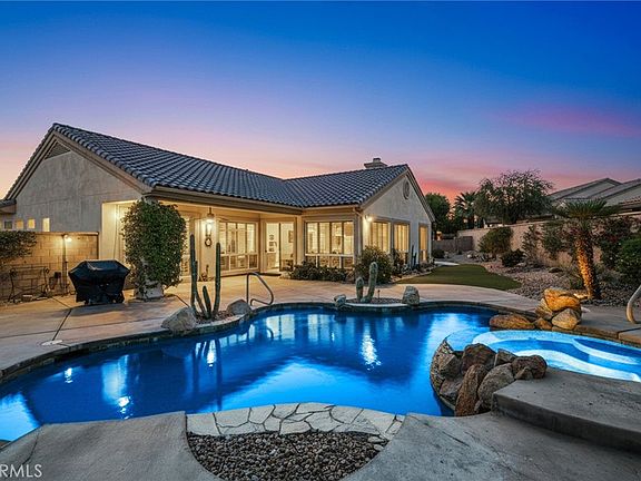 Seldom do you find a HOME in an Award Winning 55+ community with a backyard this BIG and this FUN. Situated on a quiet cul-de-sac, this private, low maintenance resort-style home sits on an exceptional 13,000+ square foot lot and West facing backyard. The 3 Bedroom, 3 Bath SAN REMO Estate Model is approximately 2,432 square feet, with a striking Pebble Tec pool and newly renovated waterfall Jacuzzi. The entire space is designed for enjoyment and relaxation, with a BBQ plumbed for natural gas, ceiling fans, covered patio, ambient night lighting, and areas that could be transformed into mini synthetic putting greens by sinking some cups into the green. Step into the house and the first thing you notice is the ample floor to ceiling windows with Plantation Shutters throughout, affording a view of the stunning backyard and providing ample light in the living spaces. The Kitchen features Granite counters, Gas burning cooktop, 2 Pantries and a Breakfast Bar. This Home has an open-concept design, with views from the Kitchen to the spacious Family Room, Formal Living Room and beyond to the Pool. There’s also a dedicated Dining Room that can easily seat your Thanksgiving guests and a sizable Inside Laundry Room with sink. The systems in this Home have been upgraded (2024) saving the inconvenience or the considerable expense of doing it yourself. They include a NEW Heating /AC system with a top-of-the line Air Filtration system plus 2 programmable thermostats and a NEW 50 gallon Water Heater with heat pump recirculation. Electricity is provided by IID, not SCE. The 2 car plus golf cart Garage has been refinished with LED lights, fully painted walls and ceiling, and an immaculate Epoxy floor. Years of good times and memories are waiting to be spent here in this exceptional HOME.