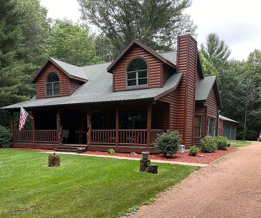 2 story log home with deeded access and lake view. 3 bed, one full bath and two 3/4 baths. 1214 sq ft on main floor which consists of kitchen/dining, living room with vaulted ceilings, gas fireplace, 2 bedrooms and full bath with laundry, Second floor is 640 sq ft which consists of master bedroom with walk in closet and 3/4 bath. Basement is finished with family room and bar, 3/4 bath with tiled shower and an extra room that can be used as den, office, game room. New stamped concrete sidewalk that leads to front porch which extends the whole width of the house. Patio door off the dinette area leads to large stamped concrete patio/firepit. Detached extra deep 3 car garage. Whole lot is just over a 1/2 acre on beautiful quiet street just across from Lake Petenwell.