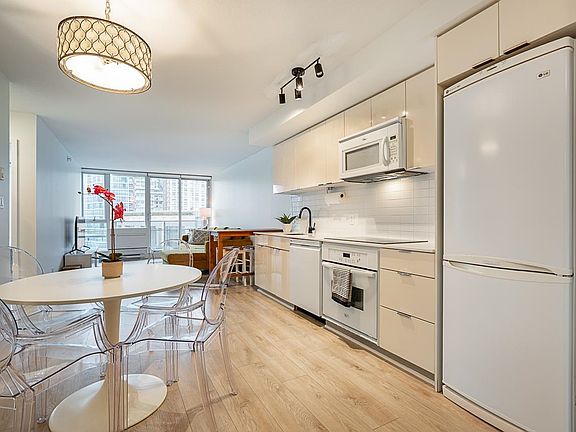 Proudly introducing this beautiful 1 Bed & Den at TV Tower by Concord Pacific. Perfectly located in the city’s downtown vibrant core! Steps from Robson Street’s diverse food options, a short walk to Yaletown, and right across from the Vancouver Public Library. Daily essentials and entertainment are close by, with Loblaws, IGA, BC Place, and Rogers Arena just minutes away. Step into this beautiful home where the floor to ceiling windows fill the space with natural light! A well planned layout with nearly $30,000 in premium upgrades including air conditioning, new flooring, new counters, new plumbing fixtures, bathroom upgrades, fresh paint and custom den storage! Amenities include a fitness centre, hot tub, sauna, steam shower, games room and theater. One parking stall included.