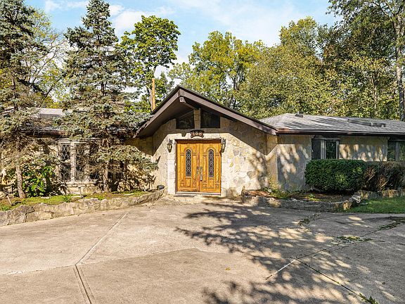 Outdoors, the property continues to impress with a circular drive offering ample guest parking, a 2-car garage, and stone exterior details that blend harmoniously with the natural surroundings. The rear yard features decks, a pool area, and a koi pond awaiting revitalization.